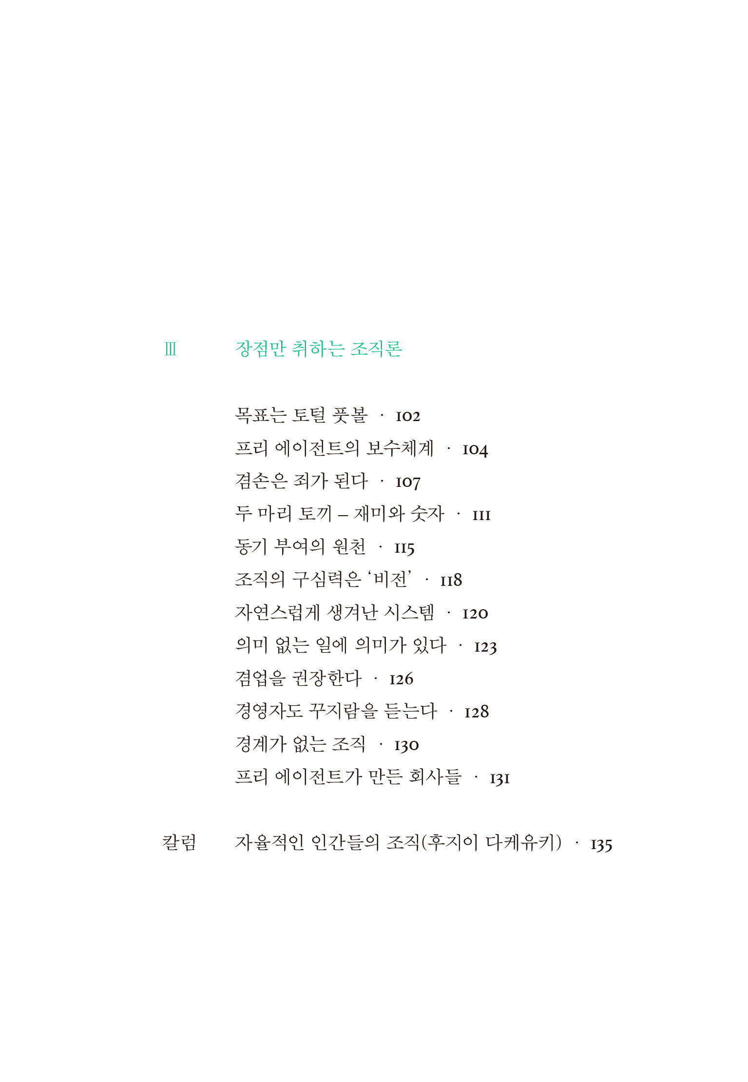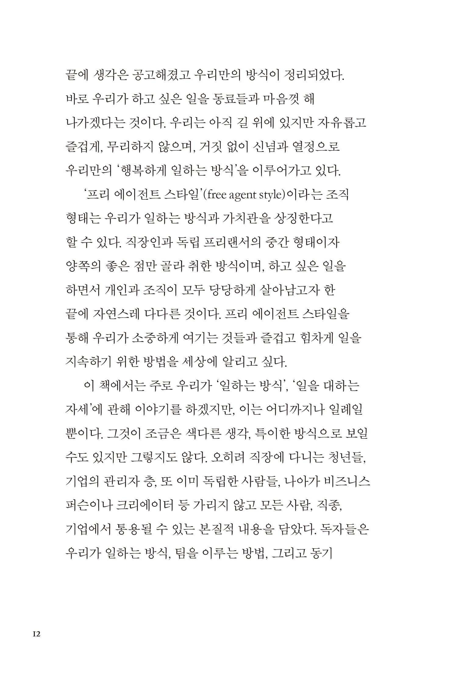 115 프리 에이전트 스타일로 일을 하려면 모티베이션, 즉 일을 지속하는 동기와 의욕이 높게 유지되어야 한다. (중략) 우리의 경우, 특히 동기 부여가 되는 요인은 ‘재미’와 ‘설득력’이다.