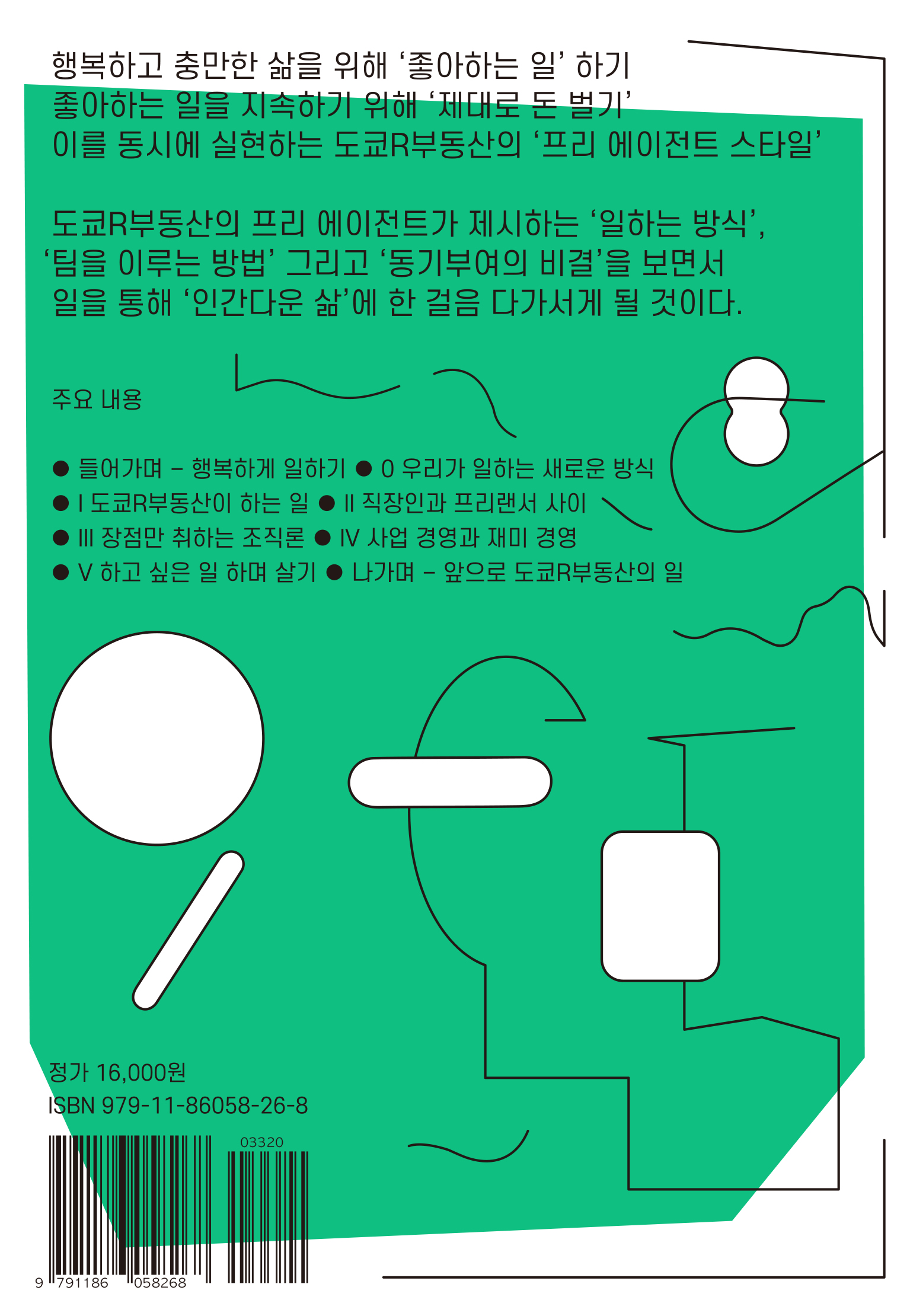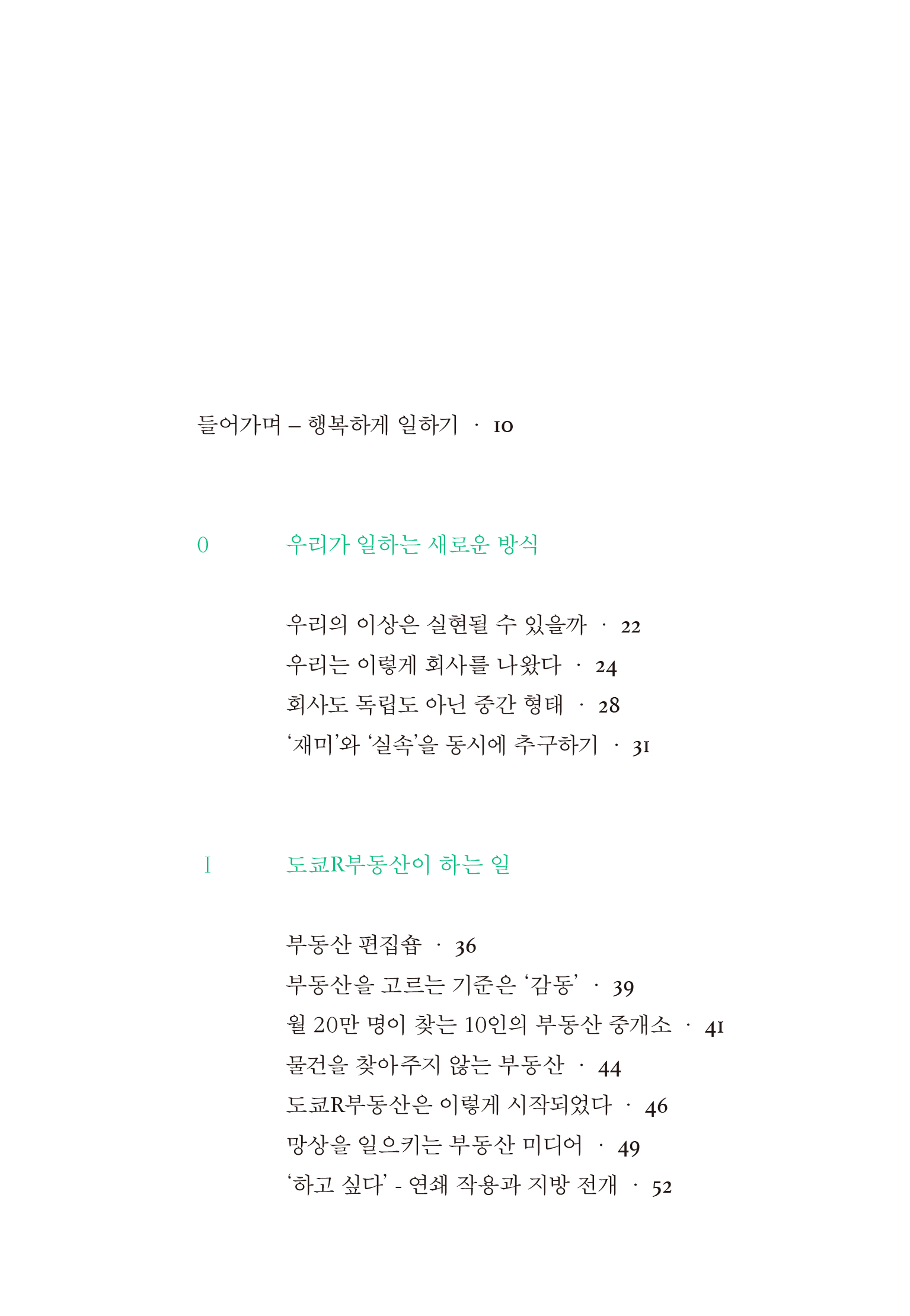31-32 도쿄R부동산은 처음부터 최우선으로 여기는 네 가지 가치 기준이 있다. 하나는 앞서 언급한 프리 에이전트 스타일의 ‘일’이다. 그리고 신뢰와 비전을 바탕으로 모인 ‘팀’. 다음은 자유와 책임, 공정성 안에서 테마를 추구하는 ‘조직 형태와 워크스타일’. 마지막으로 행복을 최적화하는 ‘자세와 가치관’이다.(중략) 네 가지를 기준으로 각자에게 적합한 것, 나아가 사업과 프로젝트를 실행하는 최적의 방법을 찾아간다.