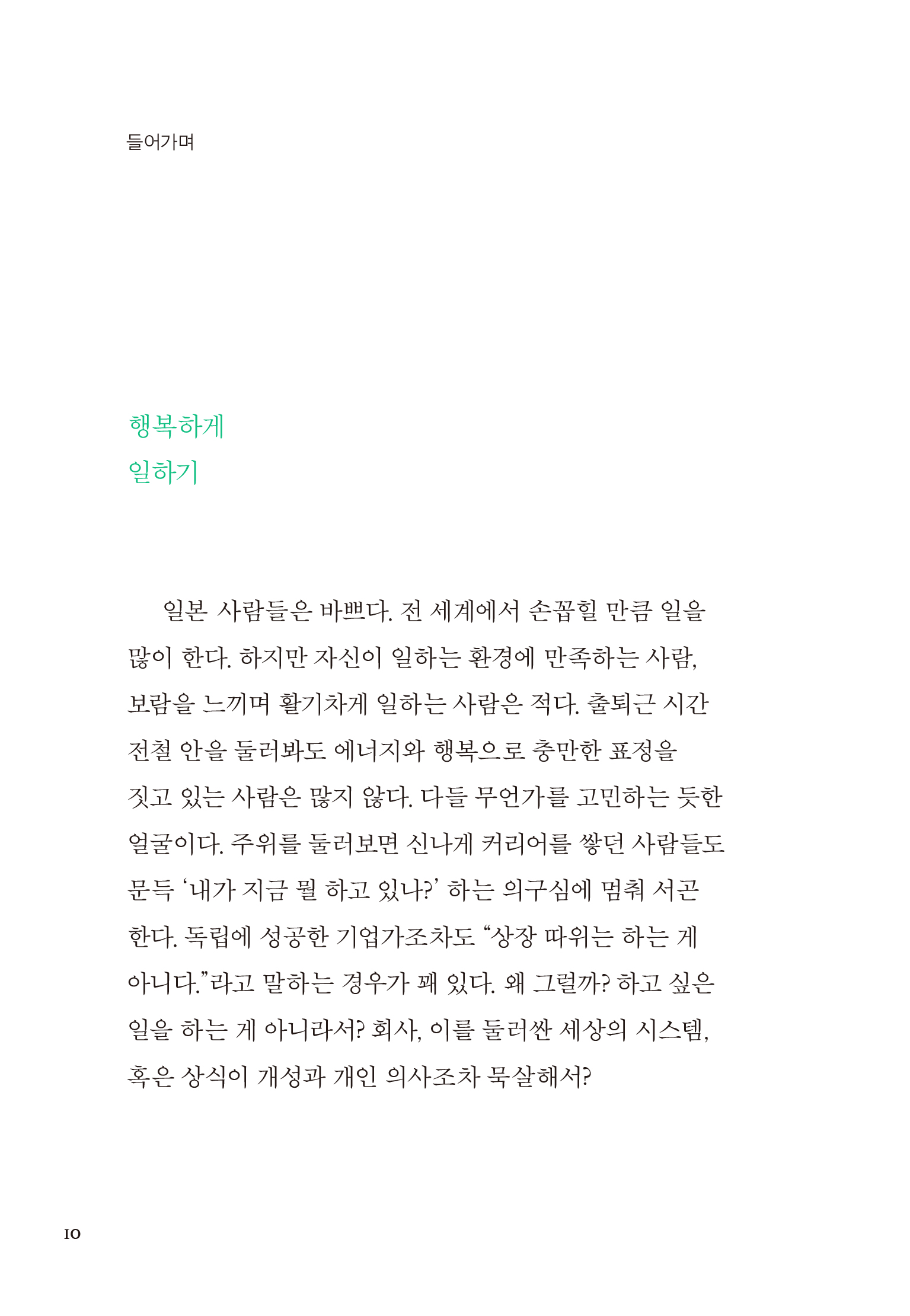 54 우리가 하는 모든 것은 ‘하고 싶다’는 욕구에서 시작된다. 그래야만 한다. ‘하고 싶은 일’을 그려가며 열심히 일할 때, 웬일인지 함께하고 싶은 사람도 만나게 된다. 그러면 좋아하는 동료와 신뢰 관계 속에서 일할 수 있다. 또 일도 성장하고 동료도 늘어나는 긍정적인 연쇄 작용이 조금씩 자연스레 일어난다. 동시에 우리가 하는 일이 사업으로서도 온전하도록 전력을 다한다. 비전과 이미지가 있고 전략과 행동을 제대로 갖출 때 비로소 직업이 된다.