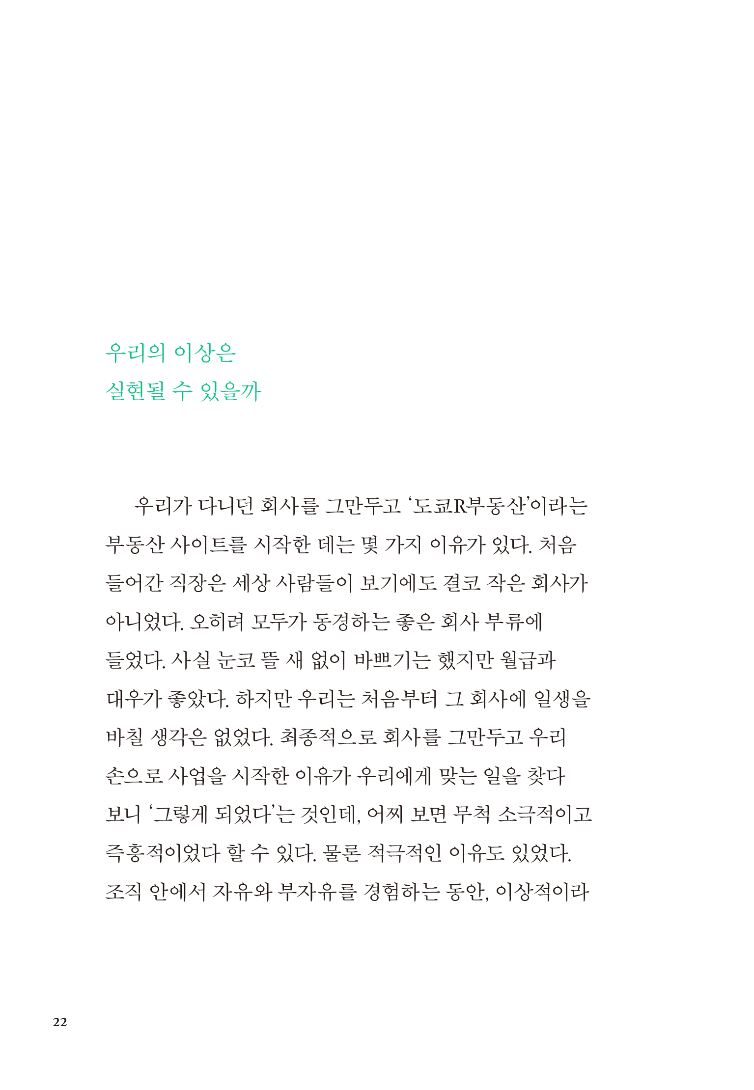 46 개인의 니즈는 점점 다양해지는데 부동산은 변함이 없었다. 우리는 그 점이 불만이었다. 동네 부동산은 취급하는 물건 정보에 일정한 기준을 적용한다고 하지만, 결국 완공 연도, 면적, 가격 등으로만 구분한다. 하지만 사람들은 정량적인 판단보다는 정성적인 감각에 따라 물건을 고르는 경우도 많을 것이다. 이를테면 ‘왠지 내 취향에 맞는 분위기’이다.