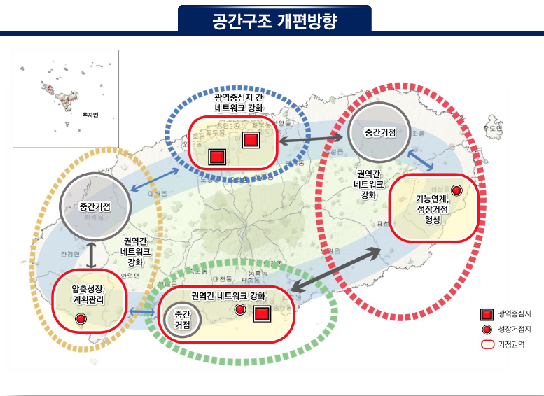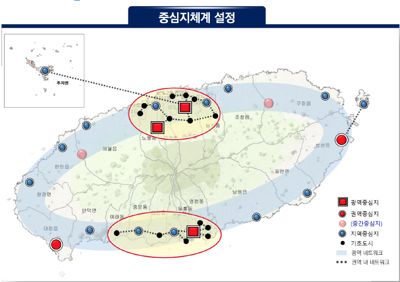 도심은 지구단위계획을 통한 계획적인 밀도 관리를 유도해 주거지역은 압축적 토지 이용, 상업지역은 용도 복합화 및 밀도 다양화를 통한 도심 활성화 전략을 제시했고, 지역 중심은 집약적으로 토지를 이용할 수 있는 콤팩트시티를 관리 방안으로 제시하고 있습니다. (관련 기사 : 제주일보 https://www.jejunews.com/news/articleView.html?idxno=2206505 )