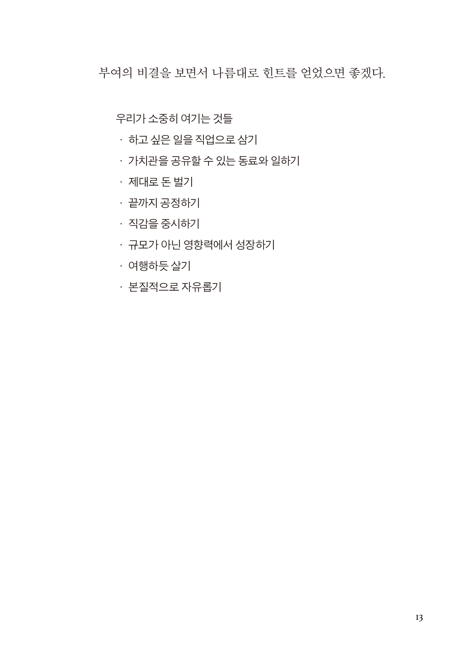 112 기본적으로 이 일이 ‘좋아서’ 모인 사람들은 애써 숫자를 의식하지 않으면 매출을 내지 못할 가능성도 있다. 때문에 좋아하는 일을 계속하려면 제대로 돈을 벌어야 한다. 이 두 가지를 같은 선에 놓고 동등한 가치로 인식하는 것이 우리 문화다.