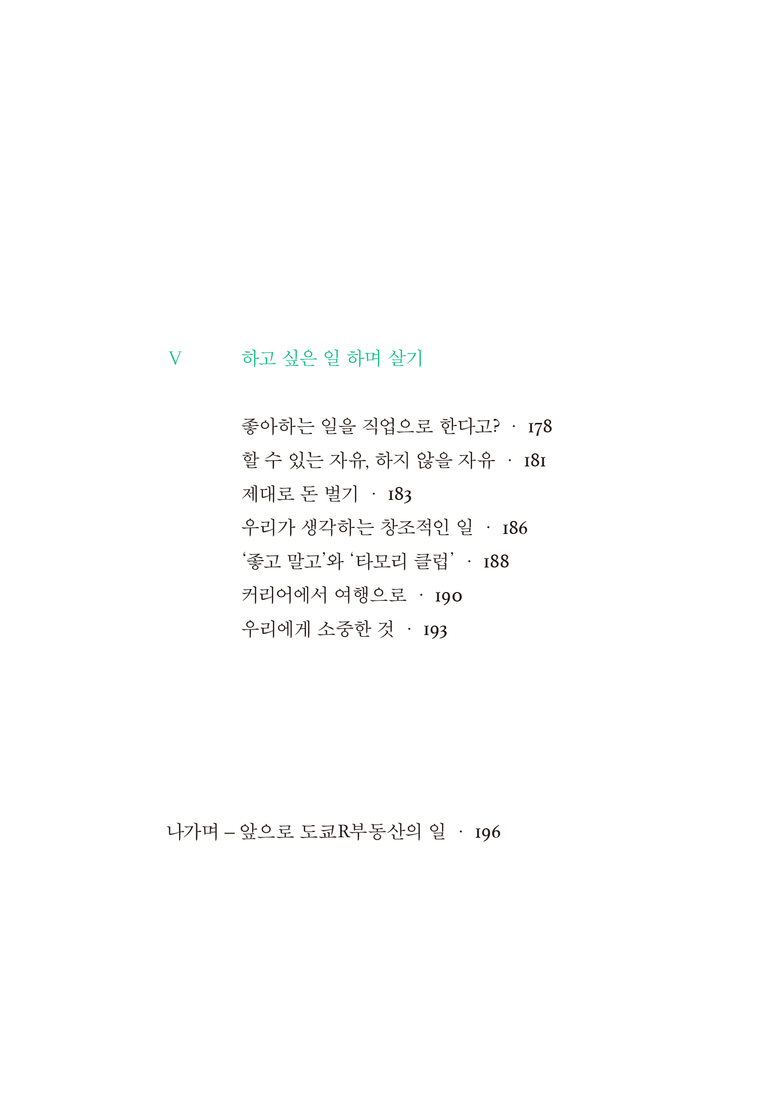 58-59 도쿄R부동산의 멤버들도 회사와 ‘계약’한 선수 개인이다. 멤버들은 도쿄R부동산의 사이트를 활동 무대로 삼아 각자 자영업을 한다고 볼 수 있다. 보수는 개인의 성과와 연동되며, 업무는 기본적으로 개인의 재량에 따르지만 서로 연계되기도 한다. 팀이 우승하면 관객 동원 수가 늘어 선수의 연봉이 오르듯, 도쿄R부동산이라는 팀도 인기가 생겨 사이트를 찾는 사람이 늘고 물건마다 문의가 늘면 이익도 생긴다. 그리고 그 이익은 멤버 개인에게 환원된다. 그래서 멤버들은 사이트를 활성화해서 보다 많은 고객을 모으기 위해 협력한다.