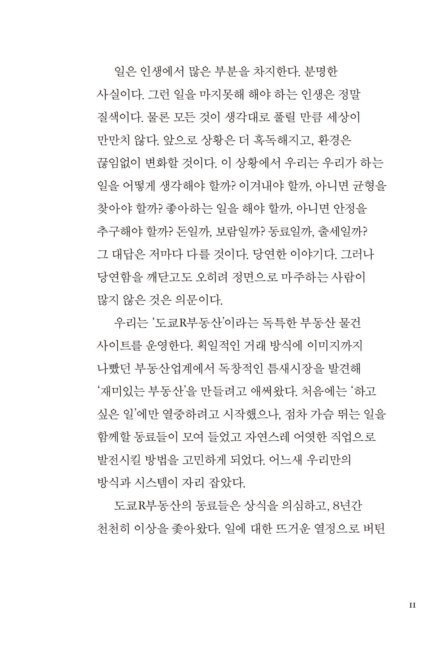 46 개인의 니즈는 점점 다양해지는데 부동산은 변함이 없었다. 우리는 그 점이 불만이었다. 동네 부동산은 취급하는 물건 정보에 일정한 기준을 적용한다고 하지만, 결국 완공 연도, 면적, 가격 등으로만 구분한다. 하지만 사람들은 정량적인 판단보다는 정성적인 감각에 따라 물건을 고르는 경우도 많을 것이다. 이를테면 ‘왠지 내 취향에 맞는 분위기’이다.