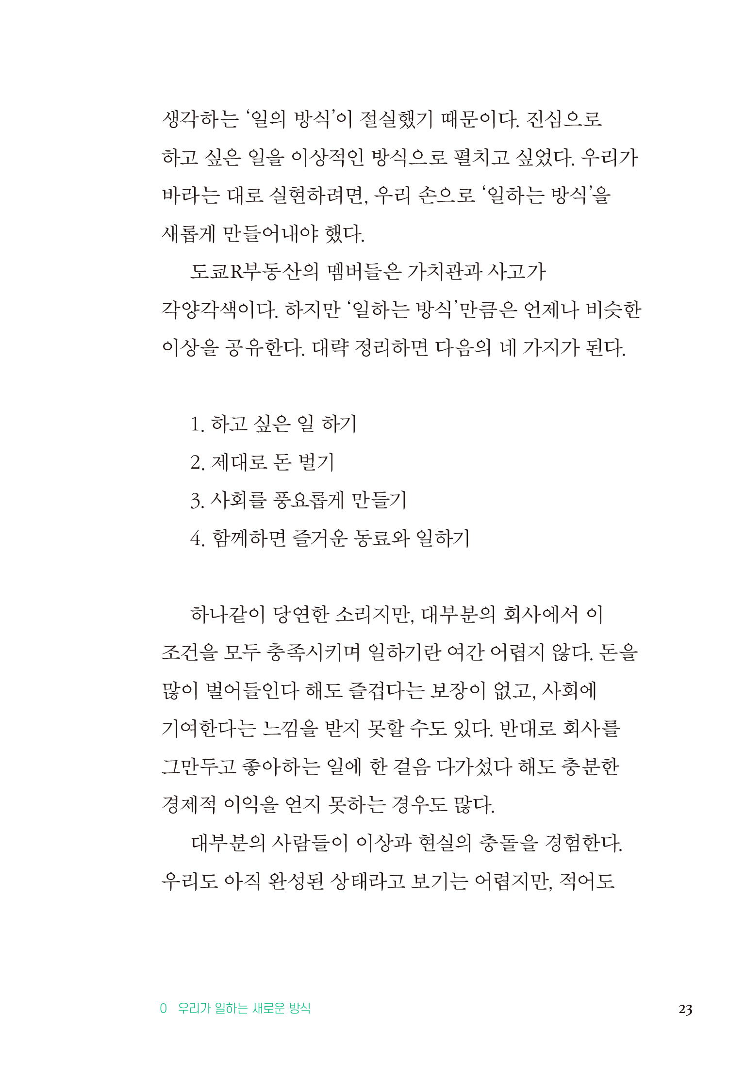 31-32 도쿄R부동산은 처음부터 최우선으로 여기는 네 가지 가치 기준이 있다. 하나는 앞서 언급한 프리 에이전트 스타일의 ‘일’이다. 그리고 신뢰와 비전을 바탕으로 모인 ‘팀’. 다음은 자유와 책임, 공정성 안에서 테마를 추구하는 ‘조직 형태와 워크스타일’. 마지막으로 행복을 최적화하는 ‘자세와 가치관’이다.(중략) 네 가지를 기준으로 각자에게 적합한 것, 나아가 사업과 프로젝트를 실행하는 최적의 방법을 찾아간다.